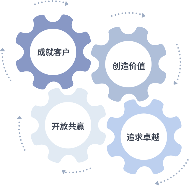 成就客户是一切决策的出发点,创造价值是衡量所有工作的标准,追求卓越是梦之城CITY OF DREAMS做事做人的态度,开放共赢是梦之城CITY OF DREAMS的格局也是最终的结果。价值观的齿轮环环相扣,推动着组织里的每个人不断向前。